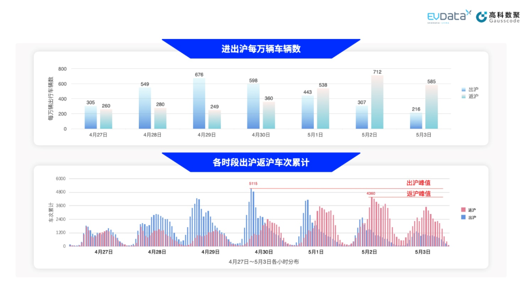 其中,出沪车辆高峰日发生在4月29日,每万辆出行车辆数676辆,返沪车辆的高峰日为5月2日,每万辆出行车辆数为712辆。